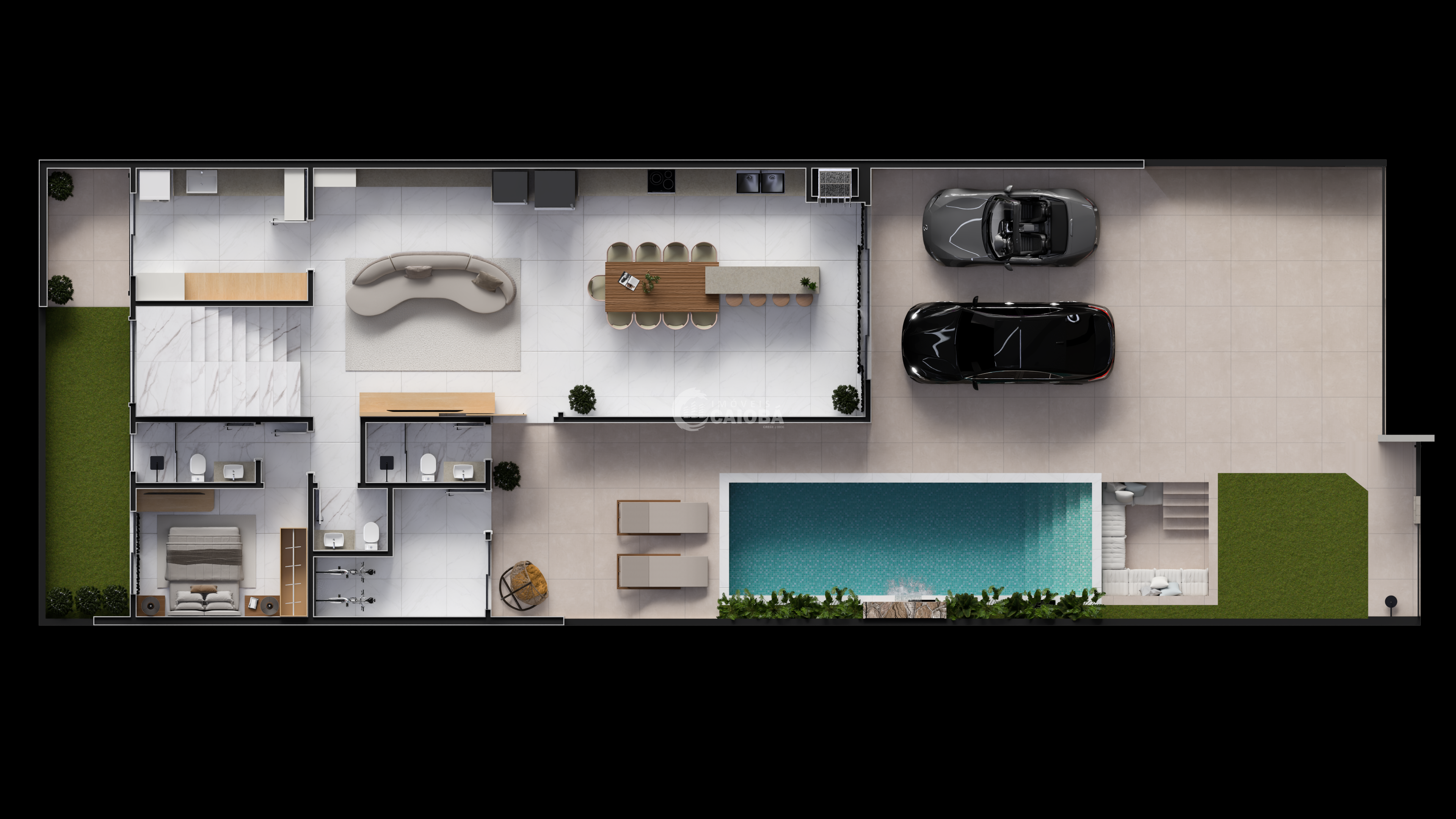 - Sala de estar, janta e cozinha em conceito aberto;