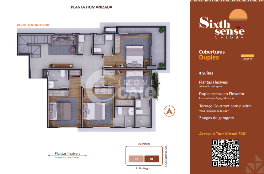 Unidade: 602 | Duplex | Dormitórios: 4 suítes | Área Privativa: 168,86 | Área Total: 219,41 | Preço de Lançamento: R$1.899.000,00 ( Tour Virtual 360º)