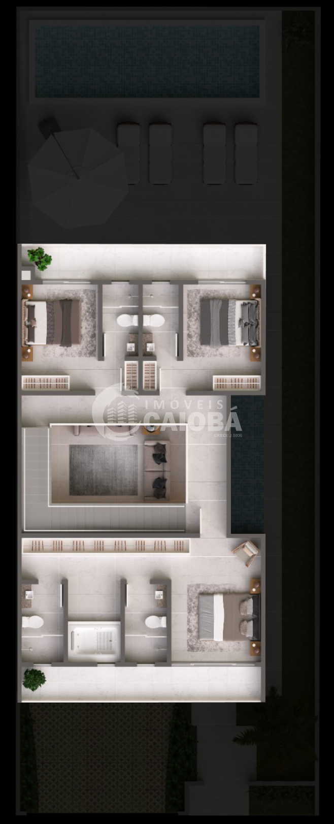 - O Imóvel do projeto possui um Pé direito Triplo no centro, para a entrada de iluminação (Podendo ser fechado e criado outro ambiente a escolha do comprador).